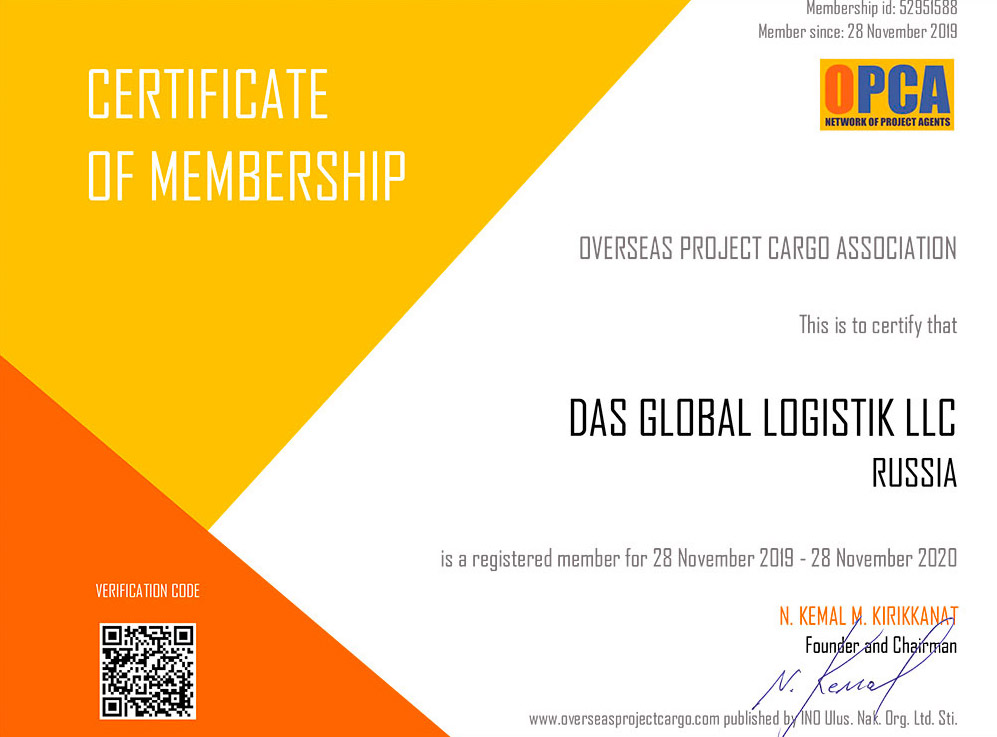 • Сертификат, подтверждающий членство в OPCA по проектным грузам на 2019-2020 гг.