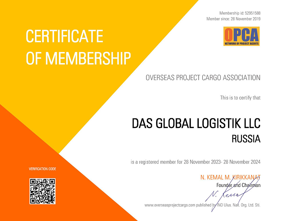 • Сертификат, подтверждающий членство в OPCA по проектным грузам на 2024 гг.