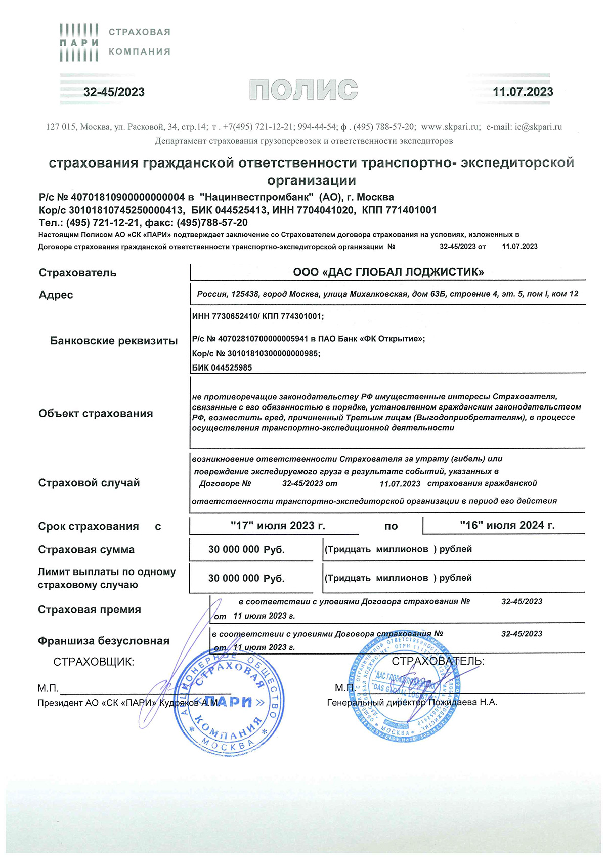 Страховая Компания АО СК ПАРИ Полис № 32-45/2023