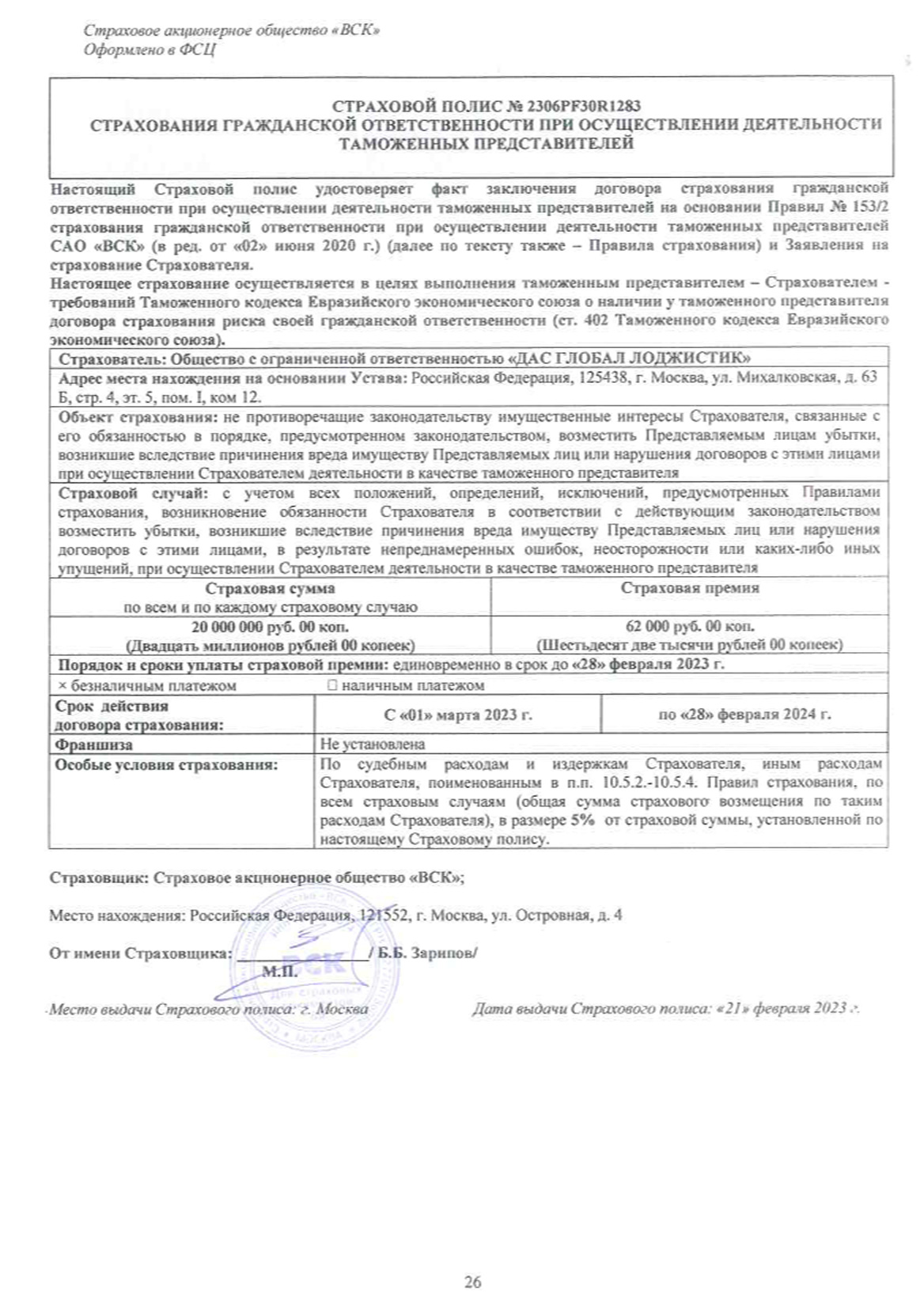 • Страховой полис (ОАО «ВСК») № 2306PF30R1283 от 01 Марта 2023 г. – страхование гражданской ответственности при осуществлении деятельности таможенных представителей.