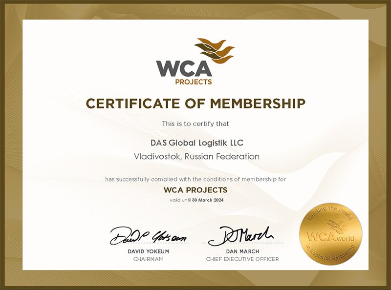 • Сертификат WCA PROJECTS, подтверждающий членство в международной ассоциации WCA PROJECTS по проектным грузам на 2023-2024 гг.