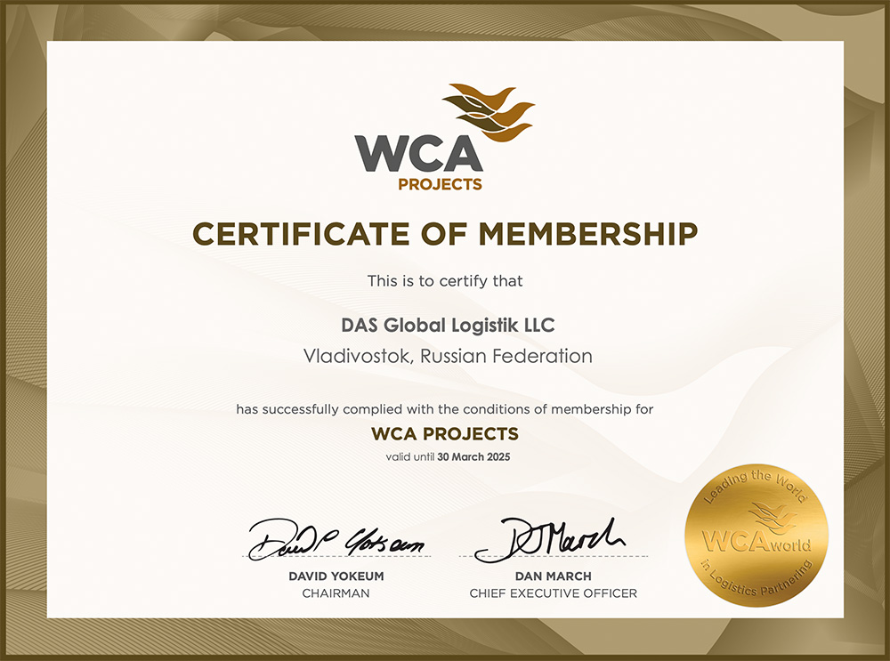 • Сертификат WCA PROJECTS, подтверждающий членство в международной ассоциации WCA PROJECTS по проектным грузам на 2026 г.