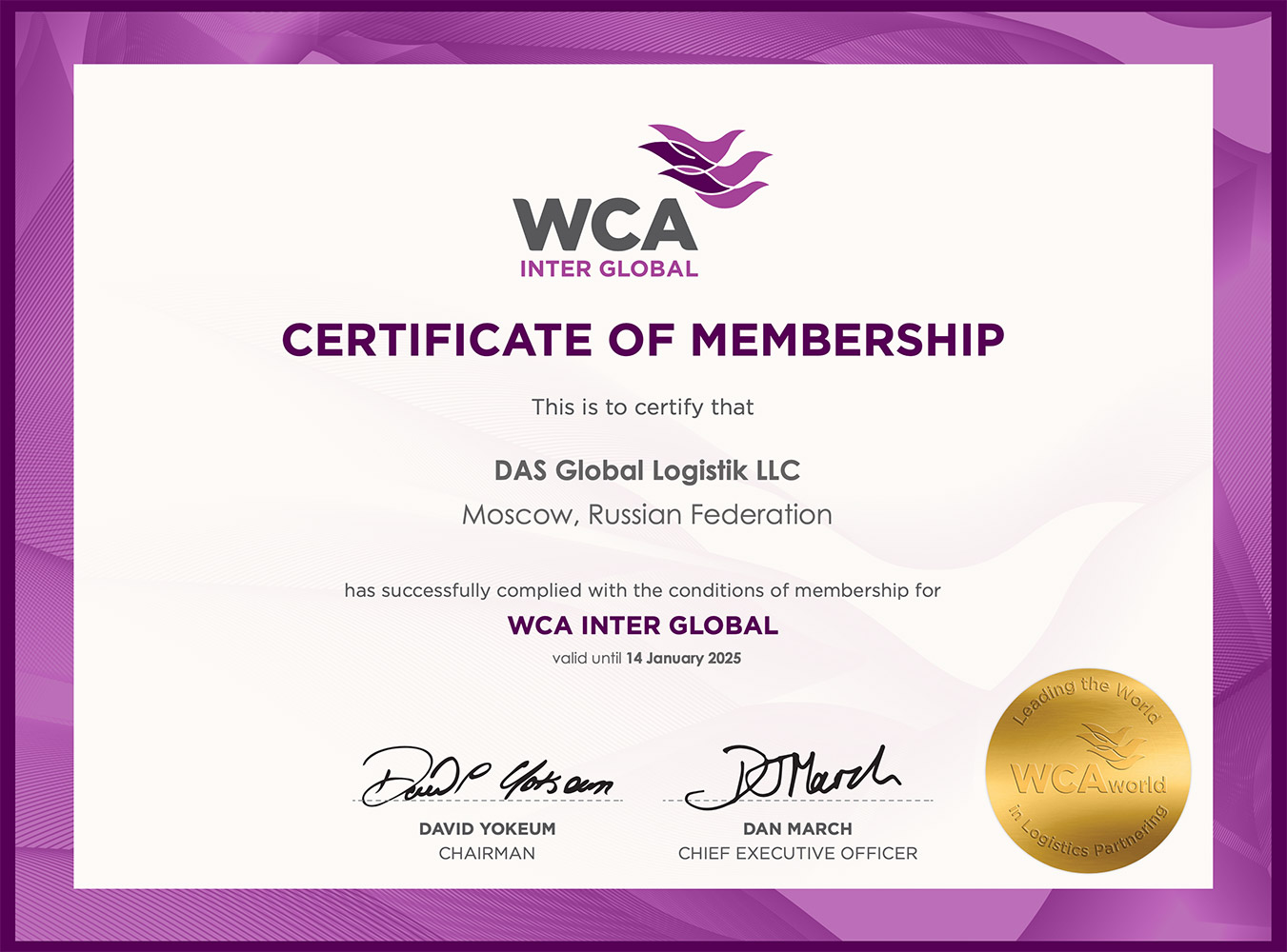 • Сертификат WCA INTER GLOBAL, подтверждающий членство в международной ассоциации WCA INTER GLOBAL по перевозке генеральных грузов на 2024-2025 гг.